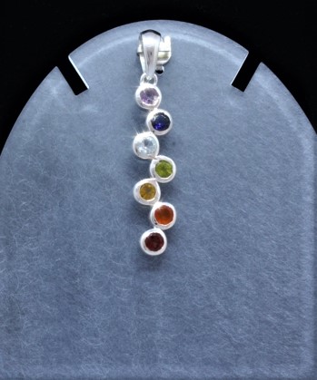 Sterling silver pendant, Chakra semi-precious round stones of Garnet, Carnelian, Citrine, Peridot, Blue Topaz, Iolite and Amethyst in an offset line 3.5 cm tall