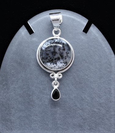 Sterling silver pendant of Dendritic Opal in a medium circle 2.1 cm diameter with silver detail under attaching a dangling Black Onyx teardrop 0.4 cm wide and 0.7 cm tall