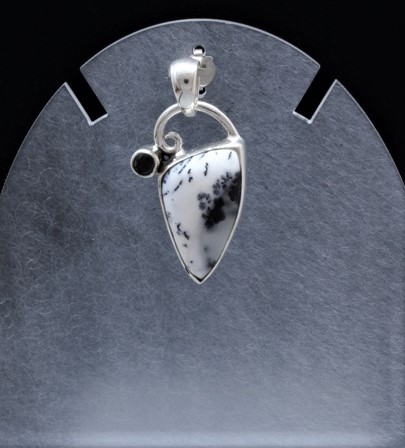 Sterling silver pendant of Dendritic Opal in a unique triangular shape 1.3 cm wide and 2.4 cm tall with a silver half circle and small round Black Onyx 0.3 cm diameter