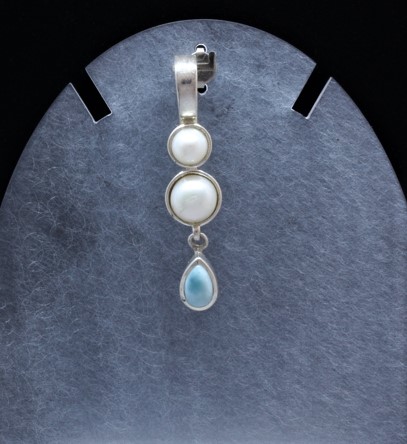 Sterling silver pendant of 2 Fresh Water Pearls, top one is 0.6 cm diameter, middle is 0.8 cm diameter and the Larimar 0.5 cm wide and 0.8 cm tall teardrop dangles on bottom
