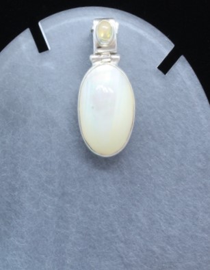 Sterling silver pendant with a large Mother of Pearl oval 1.5 cm wide and 2.4 cm tall and a rectangle bail with an Ethiopian Opal oval 0.5 cm wide and 0.6 cm tall in the center