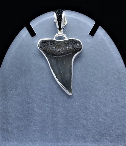 Sterling silver pendant of a Shark Tooth, medium sized 2.5 cm wide and 3.2 cm tall with a bail that has an insert of preserved string-ray skin