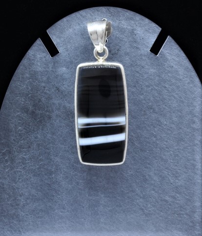 Sterling silver pendant of Banded Agate in a large rectangle 1.6 cm wide and 3.3 cm tall