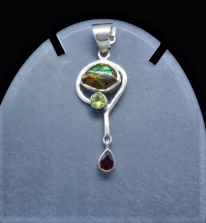 Sterling silver pendant of Ammolite 1.3 cm wide in a unique shape that shines in tones of green, blue and orange. A silver line connects the stones. A round faceted Peridot below the ammolite and a teardrop Garnet dangle at the bottom complete this piece making it 4.1 cm tall without bail