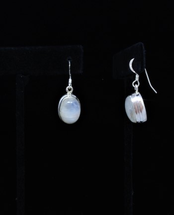 Sterling silver french hook earrings with Rainbow Moonstone medium ovals 1 cm wide and 1.4 cm tall with a tall silver border
