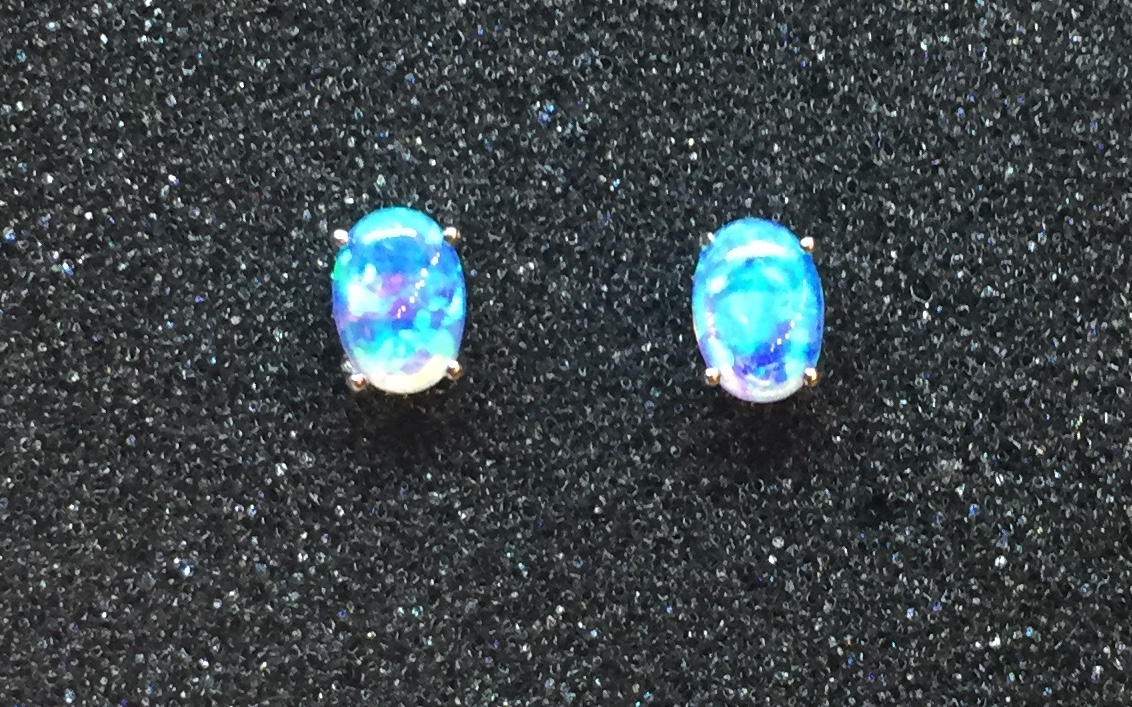 Sterling silver stud earrings post back oval blue opal 0.7 cm long 0.4 cm wide
