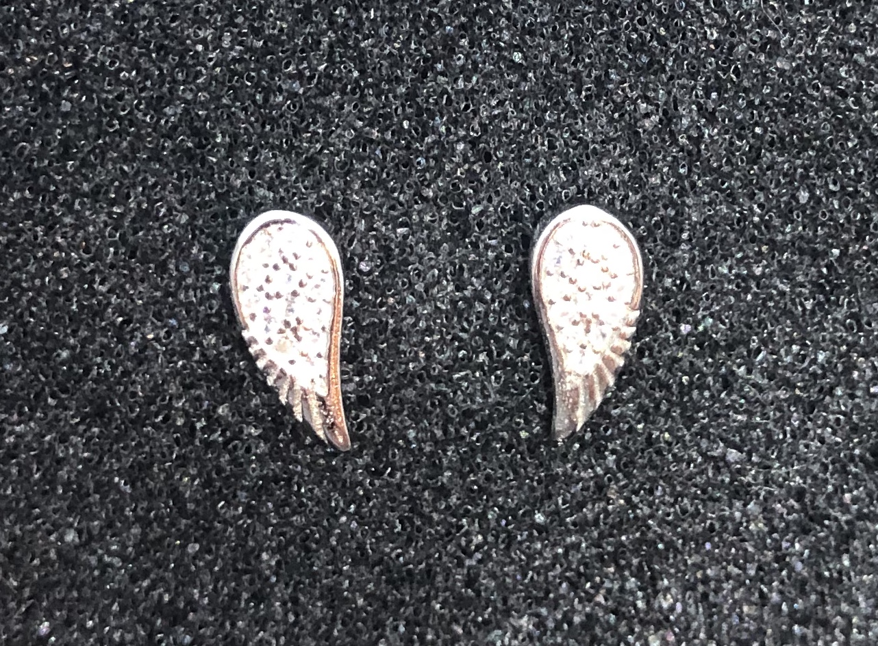 Sterling silver stud earrings post back cubic zirconia partially crusted angel wing 1.1 cm tall