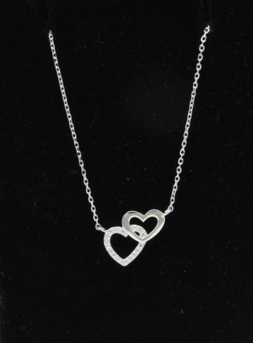 Sterling silver necklace with an attached double linked heart pendant 1.5 cm wide.  One heart is cubic zirconia and other is polished silver on a 16-17 inch adjustable chain.