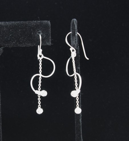 Sterling silver french hook earrings with an S curve and chain with ball end accents 4.5 cm long total and a 1.5 cm wide curve