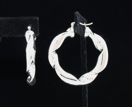 Sterling silver hoop earrings with latch closure.  Thick 0.6 cm wide with twists 4 cm diameter