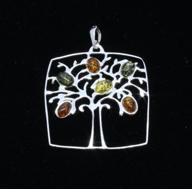 Sterling silver pendant with multi-colored amber pieces on a tree of life in a thin square border 3.5 cm
