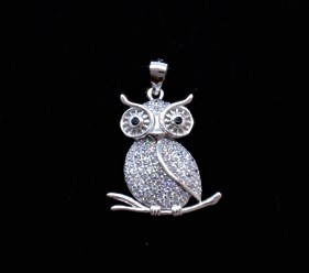 Sterling silver pendant with cubic zirconia pave owl with black eyes on a branch, 1.9 cm wide and 2 cm tall