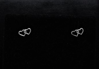 Sterling silver stud earrings with two interlocking hearts, 0.8 cm wide and 0.4 cm tall