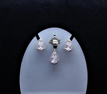 Sterling silver pendant/stud set with a clear teardrop and cubic zirconia border.  Pendant is 0.7 cm wide and 0.9 cm tall and the studs are the same 0.7 cm wide and 0.9 cm tall