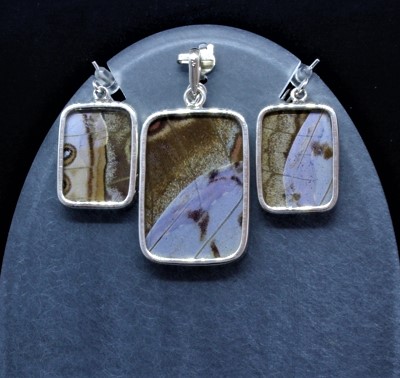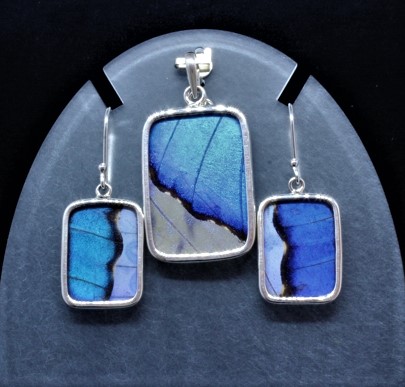 Real butterfly wing pendant and french hook earrings in sterling silver which are two sided (see pictures). Large rectangles in blue colors in front. Has a small silver butterfly charm on the pendant: 2.1 cm wide and 3 cm tall. Earrings are 1.6 cm wide and 2.1 cm tall. Wings are collected from deceased butterflies on rainforest floor then preserved and sold to fund protection of the rainforest.