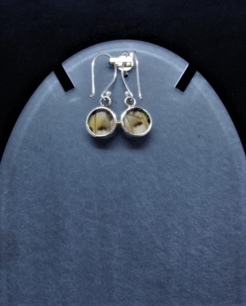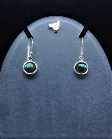 Real butterfly wing french hook earrings in sterling silver which are two sided (see pictures). In the front, they are black color but shines teal at certain angles and are small circles of 1 cm diameter. Wings are collected from deceased butterflies on rainforest floor then preserved and sold to fund protection of the rainforest.