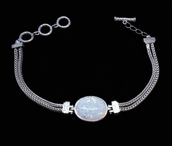Sterling silver bracelet with white lab created Opal in a large oval 1.6 cm wide and 1.4 cm tall with a double braids in silver.  Adjustable length of 6.5-8 inches with a T-bar closure