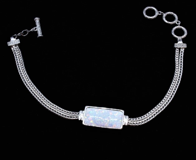 Sterling silver bracelet with white lab created Opal in a large rectangle 1.9 cm wide and 1 cm tall with silver double braids.  Bracelet adjusts in length 6.5-8 inches with a T-bar closure