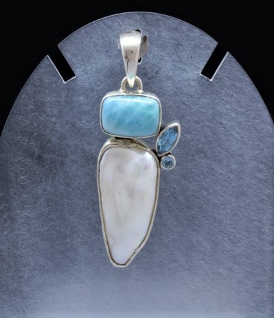 Sterling silver pendant, 4 pieces include Larimar rectangle 1.4 cm wide and 1 cm tall, Mother of Pearl 1.5 cm wide and 3.1 cm tall and 2 small Blue Topaz - circle 0.3 cm diameter and pointed oval 0.4 cm wide and 0.8 cm tall