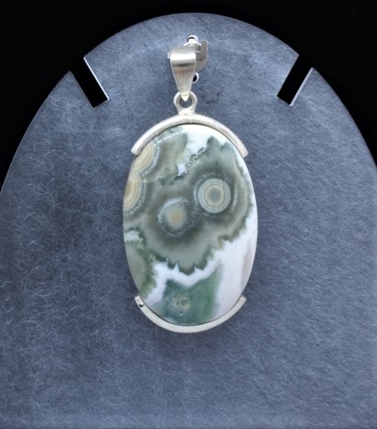 Sterling silver pendant of Ocean Jasper in large oval, 2.3 cm wide, 3.5 cm tall, with silver border at the top and bottom.